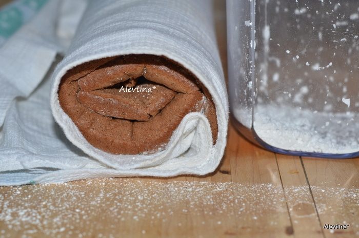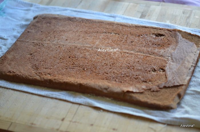 Приготовить легкое полотенце, посыпать сахарной пудрой, для того чтоб бисквит не прилип. Выложить готовый бисквит сразу после духовки на полотенце.
