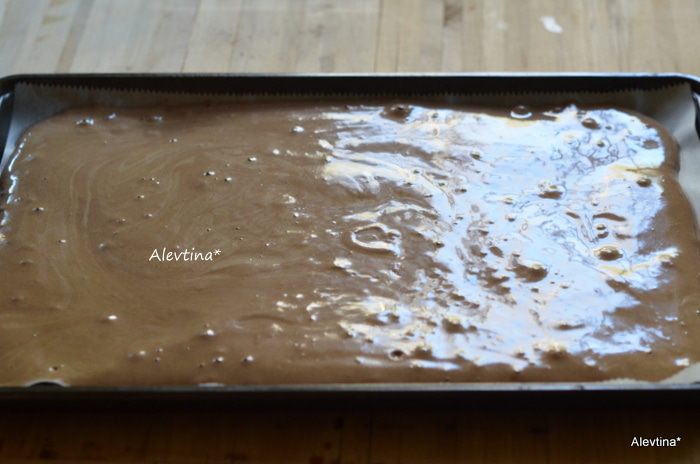 Вылить на готовый противень, разровнять и поставить в духовку на 12-14 мин.