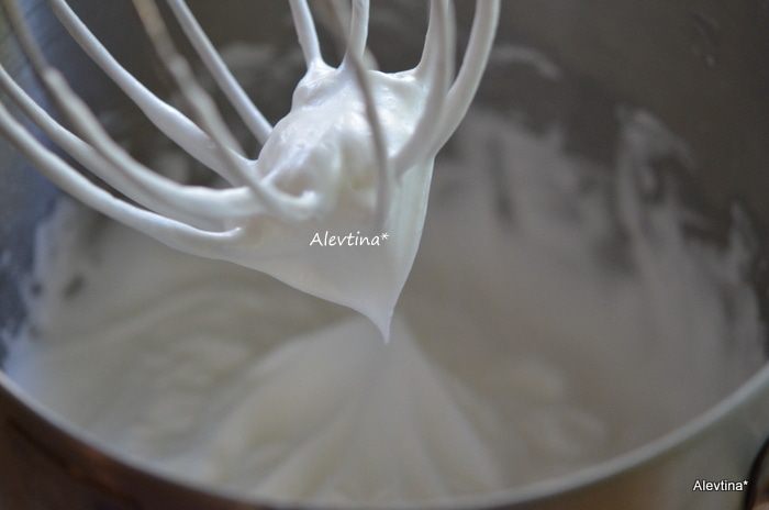 В другой емкости взбить белки на высокой скорости, добавив сразу винный камень, соль в пену. Затем добавим ¼ стакан сахар. Взбивать 5 мин. до средних пиков .