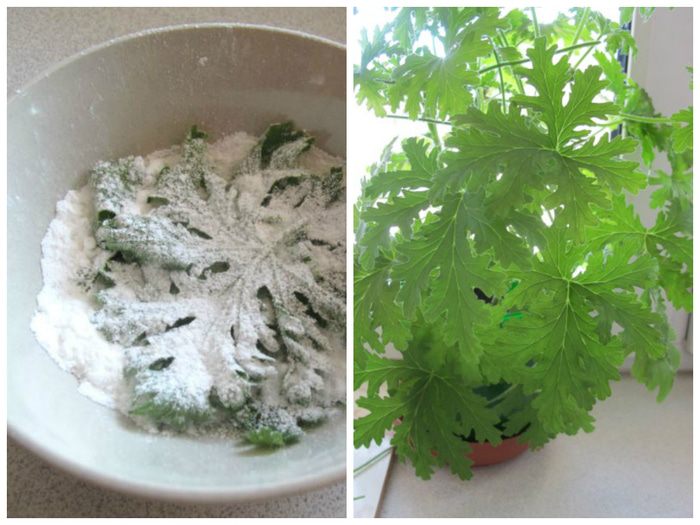 За пару дней до приготовления кекса, я засыпала листья герани сахарной пудрой и отдельно сахаром, и поставила настояться.