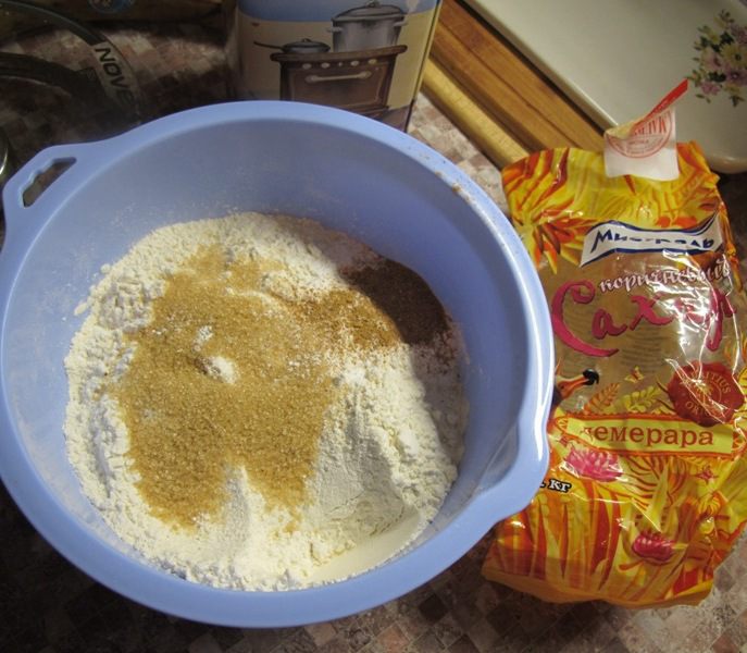 Муку просеять, смешать с кукурузной мукой, разрыхлителем и добавить тертую или сухую цедру цитрусовых.