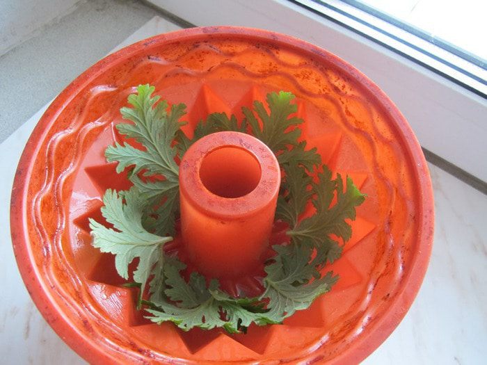 Свежие листья герани, вымойте, обсушите салфеткой, отрежьте черенки. Выложите форму листьями и заполните тестом.