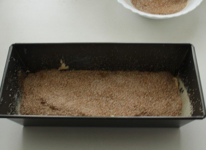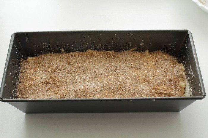 Выложить половину тесто в подготовленную форму, посыпать 3/4 от общего количества сахара с корицей, распределив равномерно по всей поверхности.
