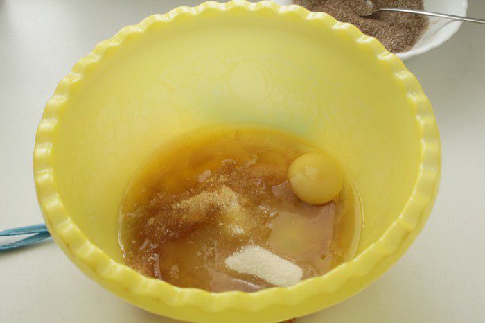 Сливочное масло растопить, немного остудить, добавить яйцо, сахар, растительное масло, ванильный сахар и взбить.