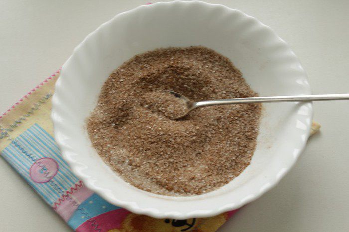 Смешать сахар с корицей и перемешать, отставить в сторонку.