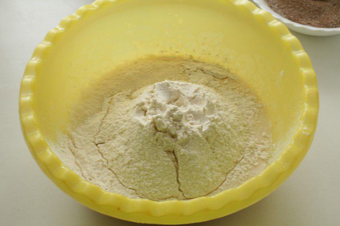 Просеять муку с разрыхлителем, добавить соль.