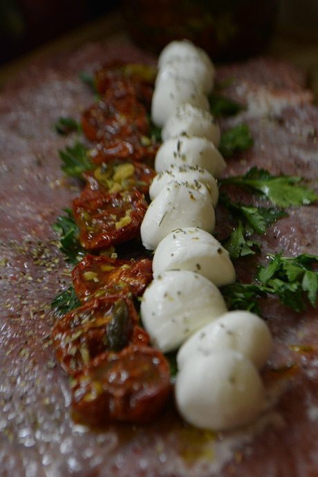 Мясо сбрызнуть соком лимона, посолить и поперчить по вкусу. Уложить по середине листья базилика (в моем случае петрушка), на него ряд вяленых томатов и рядом кружочки моцареллы. Посыпать все итальянскими травами.