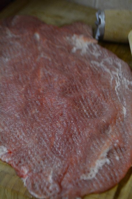 Свиную вырезку помыть, обсушить бумажным полотенцем. Срезать все пленочки и лишний жир. Надрезать ножом вдоль, не доходя до конца и раскрыть как книгу. Отбить в тонкий пласт.