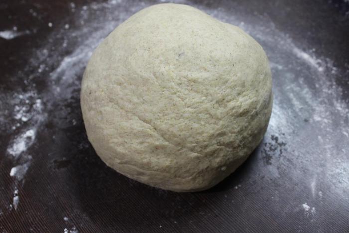 На присыпанной мукой поверхности хорошенько вымешиваем тесто, при необходимости подсыпая муку ( у меня ушло дополнительно грамм 50). Вымешиваем минут 7-10, формируем шар, кладем его в смазанную растительным маслом миску, накрываем полотенцем и ставим в теплое место без сквозняков на 1 час для подъема.