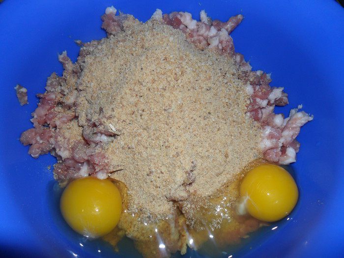 Перемолоть на фарш. Смешать фарш, панировочные сухари, 1 крупное или 2 маленьких яйца, шалфей, соль и перец. Все хорошо перемешать.