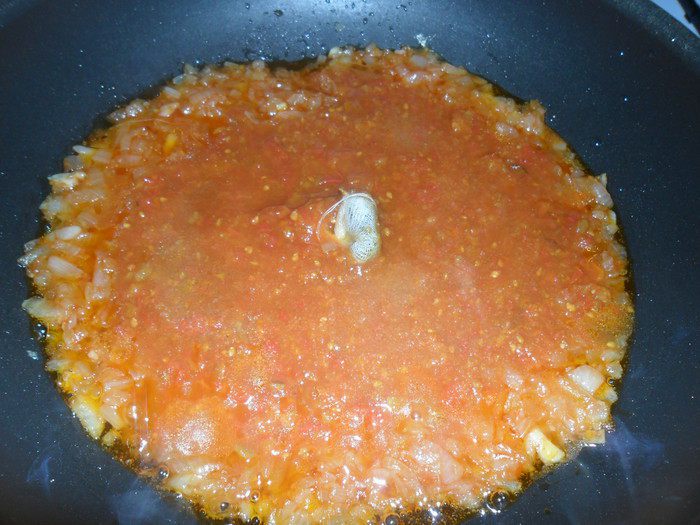 Положите перетертые томаты, томатную пасту, букет гарни, сахар и доведите до кипения. Варите 10-15 минут, пока соус не загустеет. Выньте букет гарни и разбавьте соус водой, где-то 150-200 мл.