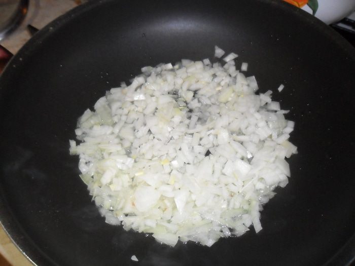 Приготовьте соус: разогрейте масло, положите лук и жарьте до мягкости 3-5 минут. Добавьте истолченный чеснок и жарьте еще 30 сек.