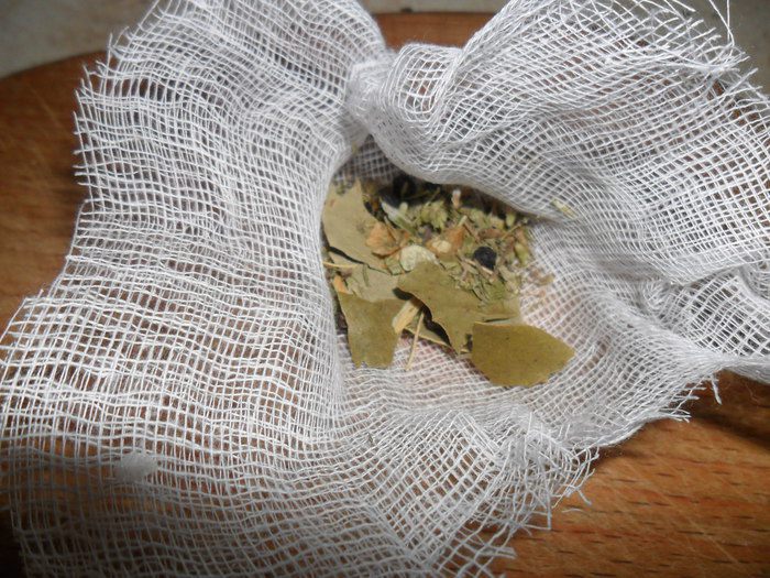 Букет гарни: возьмите лавровый лист, веточку свежей или чуть сухой петрушки и тимьяна, 5-6 горошков черного перца и все это завяжите в маленький узелок из марли.
