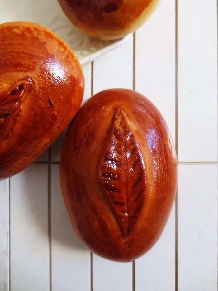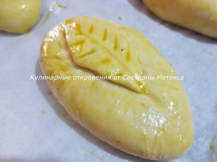Противень застелить бумагой для выпечки, положить в два ряда пирожки, оставив расстояние между ними. Смазать пирожки взбитым желтком, смешанным с молоком, оставить на 15 минут.