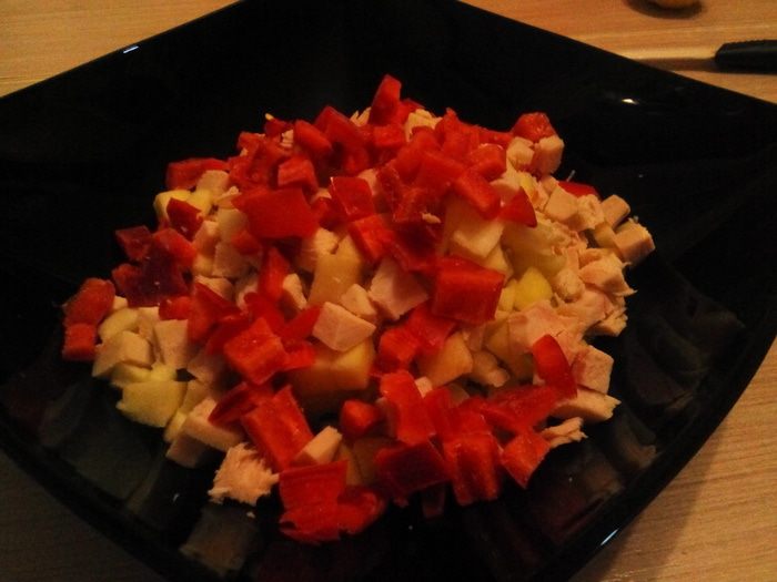 Курицу, перец, очищенное яблоко нарезать кубиком. Сельдерей почистить и тоже порезать.