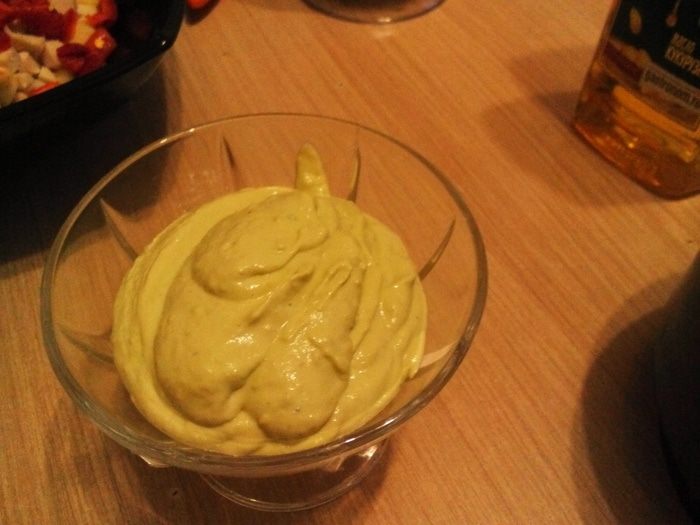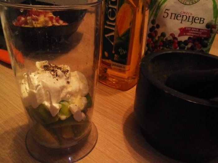 Для соуса: авокадо, сметану, лимонный сок, соль, свежемолотый перец взбить в блендере до однородности.