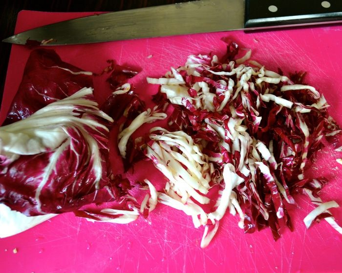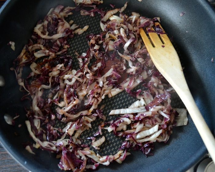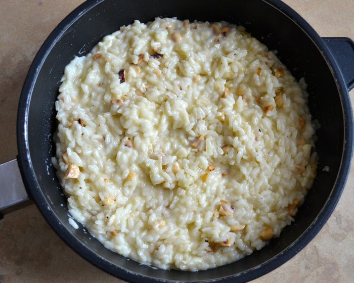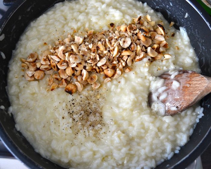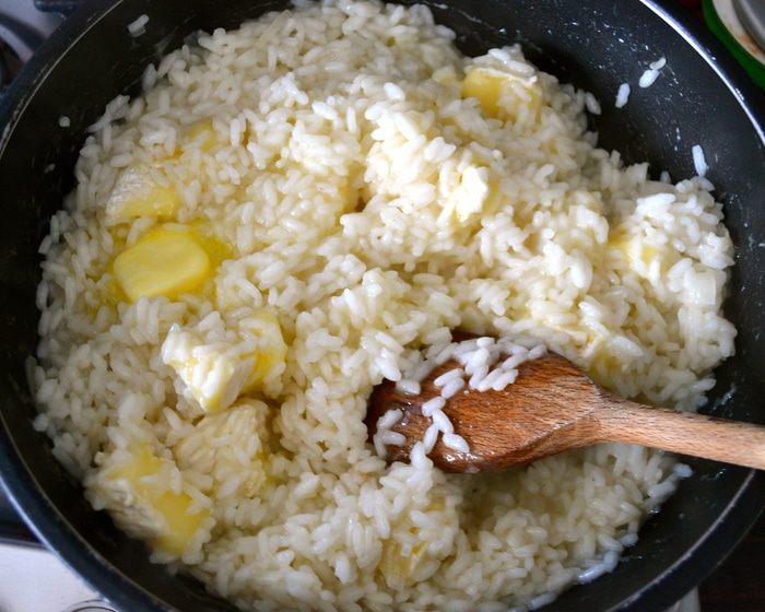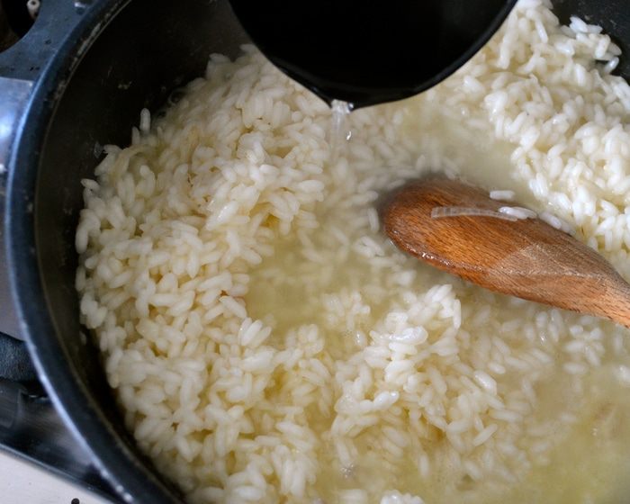 Влить пару половников горячего бульона. Не буду в данном рецепте подробно останавливаться на бульоне. Подробнее о нем можно прочитать в других моих рецептах ризотто. Например, здесь http://www.edimdoma.ru/retsepty/67227-rizotto-s-pryanymi-travami-dlya-yuli-shprot Готовить ризотто, подливая понемногу бульон, по мере того, как он будет впитываться рисом. В процессе посолить.