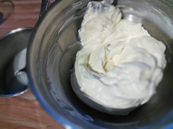 Маскарпоне смешала лопаточкой с сахарной пудрой, ванильными зёрнышками, йогуртом (у меня ванильный). Тут в оригинале шел желатин, но мне показался он лишним, крем и без него отличный, главное, не мешать очень интенсивно. Размешала и поставила на 2 часа в холодильник.