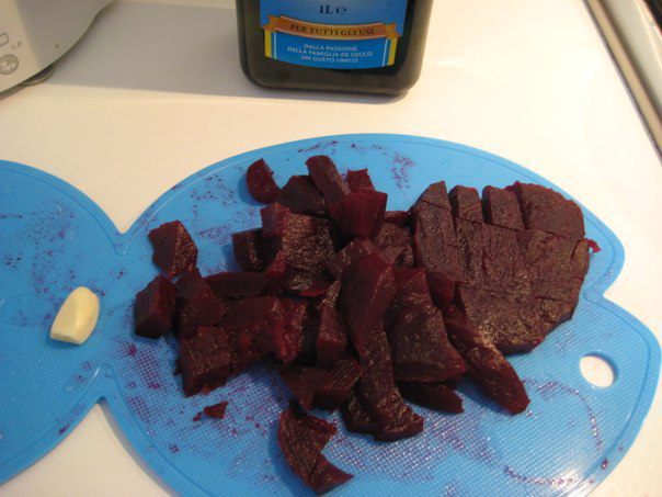 Если нет кухонного комбайна, то свеклу, чеснок и пармезан потереть на мелкой терке, орехи мелко порубить и смешать с остальными ингредиентами.