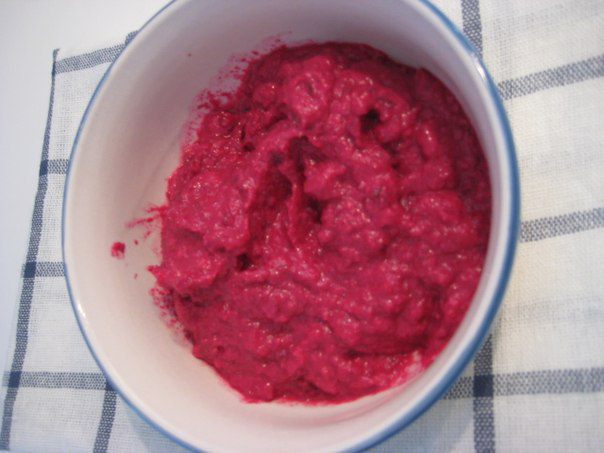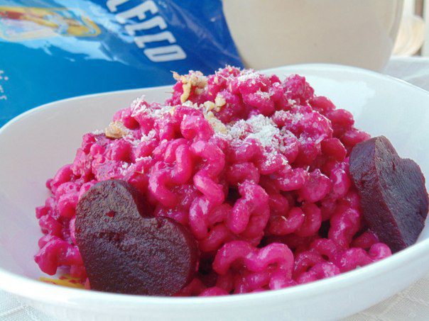 В кухонном комбайне измельчить свеклу, пармезан, чеснок, грецкие орехи. Влить сливки, оливковое масло и лимонный сок. Посолить по вкусу.