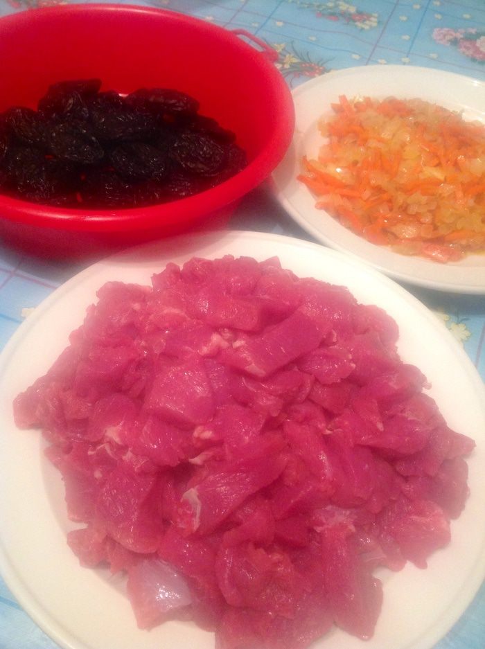 На раскаленной сковороде обжарить мясо. Когда жидкость начнет выпариваться, добавить соль, все специи и обжаренный лук с морковью. Добавить лавровый лист и конечно весь наш чернослив.