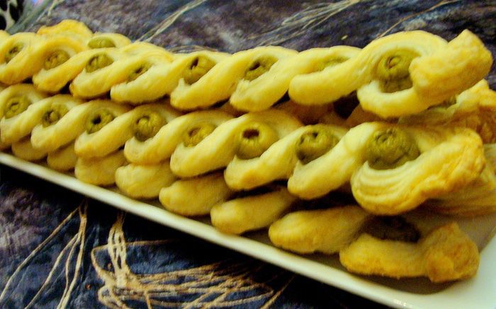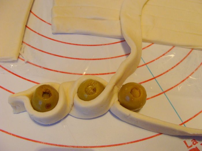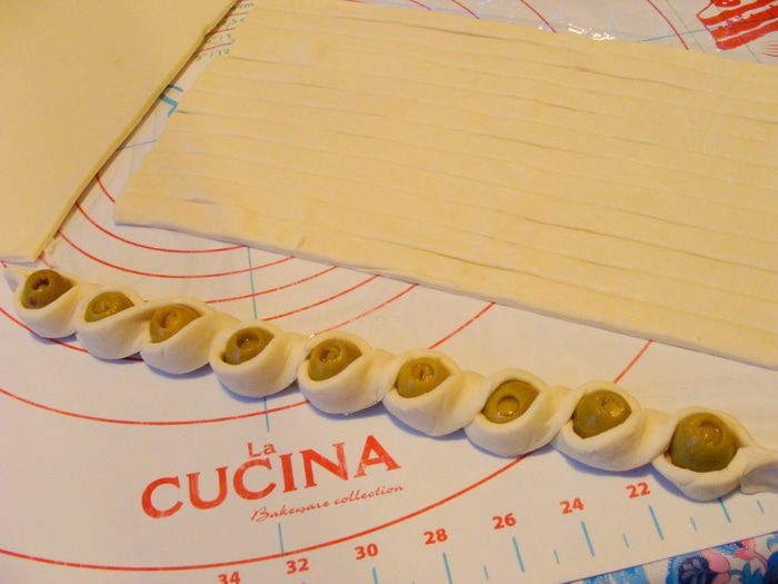 Взять две полоски, слепить концы и, вставляя оливки, заплести косичку (жгут).