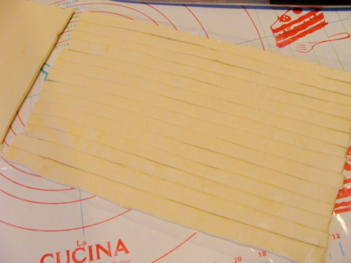 Тесто разморозить, нарезать на полоски по 1 см (примерно) шириной.