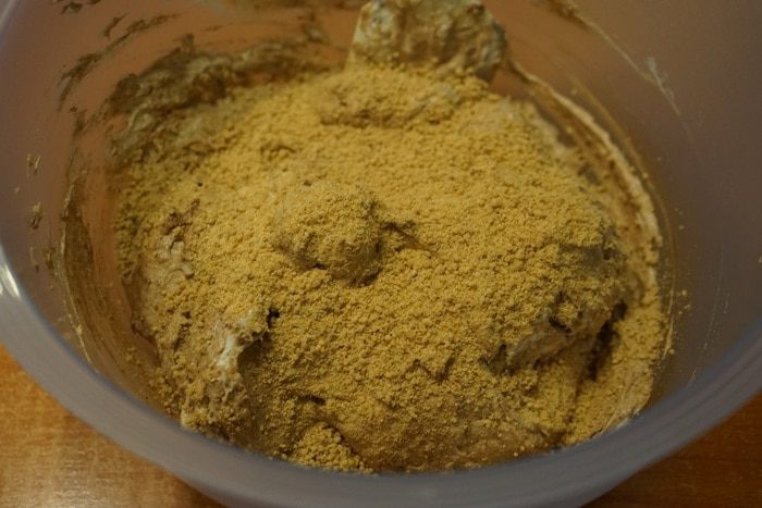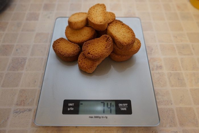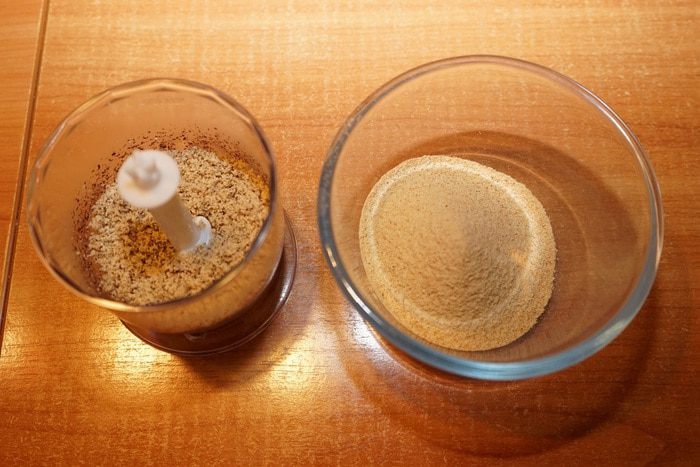 Белые сухари (у меня готовые ванильные или можно самостоятельно подсушить ломтики белого хлеба в духовке) измельчить в кофемолке в муку. Надо взять сухарей с запасом, например, грамм 70-80, обязательно просеять – получится как раз 60 грамм сухарной муки.