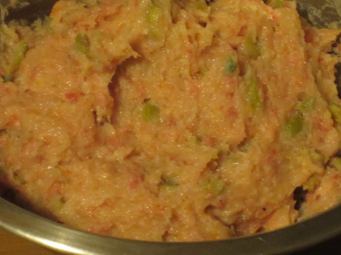 Куриную грудку крупно нарезать, поместить в блендер, добавить мякиш хлеба, яйцо, молоко, соль и пюрировать до получения однородной массы.