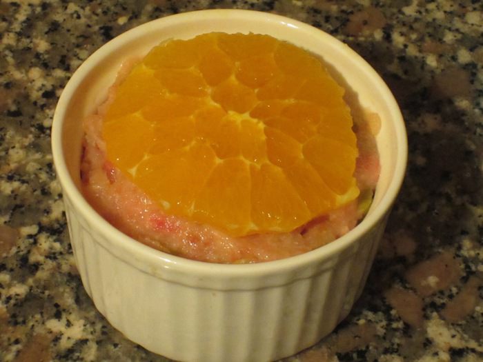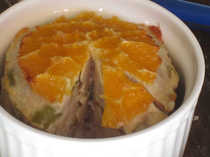 Небольшие формочки для запекания смазать оливковым маслом и разложить массу. Сверху выложить кружочки апельсина. Формочки поставить в глубокий противень с водой и запекать в разогретой до 180 С духовке 1 час и 15 минут.