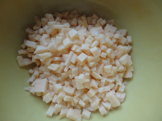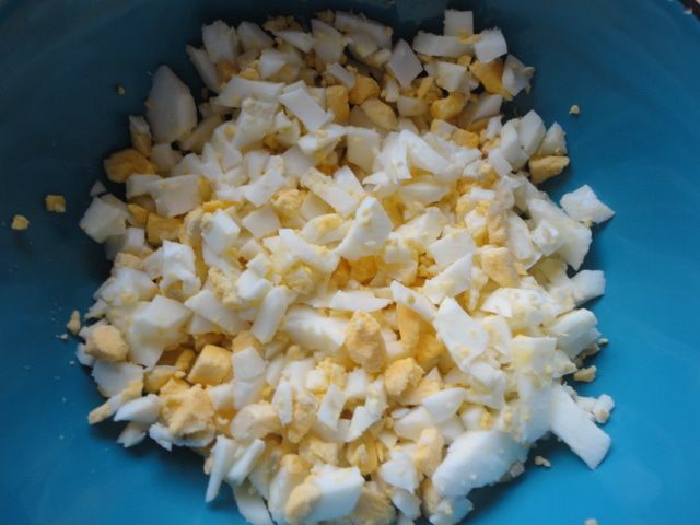 Яйца нарезать мелким кубиком.