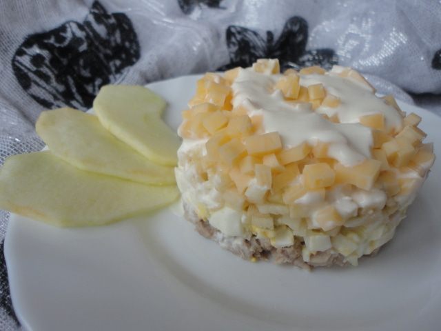 Собираем салат в кулинарное кольцо: Мясо 1 ч.л. заправки Яблоко 1 ч.л заправки Яйцо 1 ч.л заправки Сыр 1 ч.л заправки Приятного аппетита:)