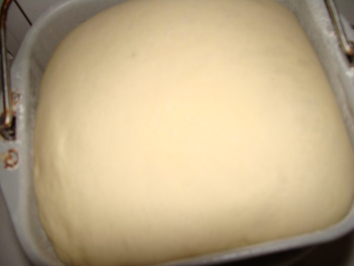 Залить дрожжи 30 мл теплой воды. Дать подняться. На дно хлебопечки вылить холодное молоко, яйцо. Просеять муку. Добавить сахар, соль, растительное и сливочное масло, ванилин при желании. Сверху вылить дрожжи. Поставить на режим замешивания теста. У меня этот режим длится 1 час 40 минут. За это время тесто сильно поднимается.