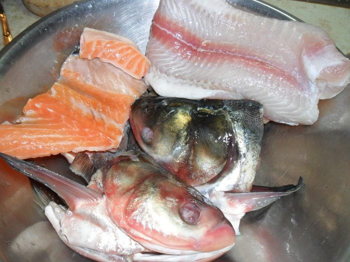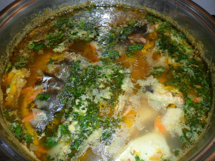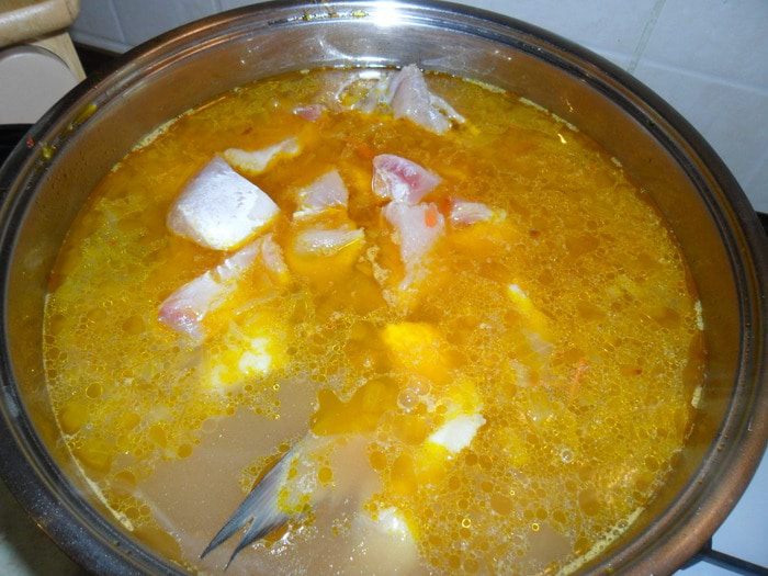 Когда картофель будет почти готов, солим, добавляем лавровый лист и приправляем(по чуть-чуть паприки, кориандра, куркумы, кари, смеси перцев, базилик и чабер). Добавляем рыбку, филе нарезаю кусочками и после того как закипит уменьшаем огонь на минимум, чтобы кипела очень медленно минут 15-20 и не накрываем крышкой.