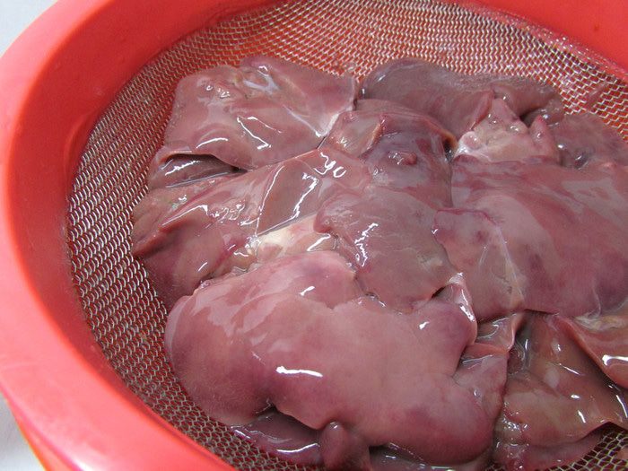 Печень хорошо промойте, освободите от пленок и откиньте на дуршлаг, чтобы стекла лишняя вода.