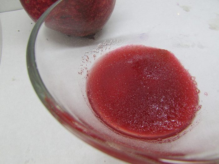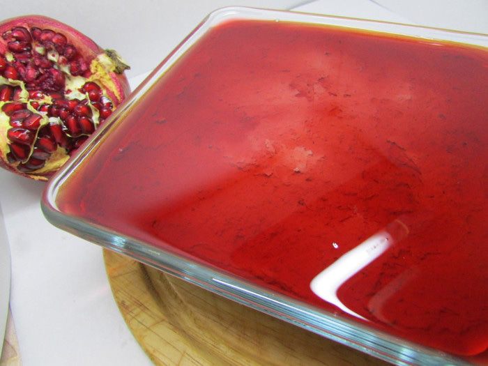 В желатин добавьте 3-4 ст.л. гранатового сока. Дайте желатину набухнуть.