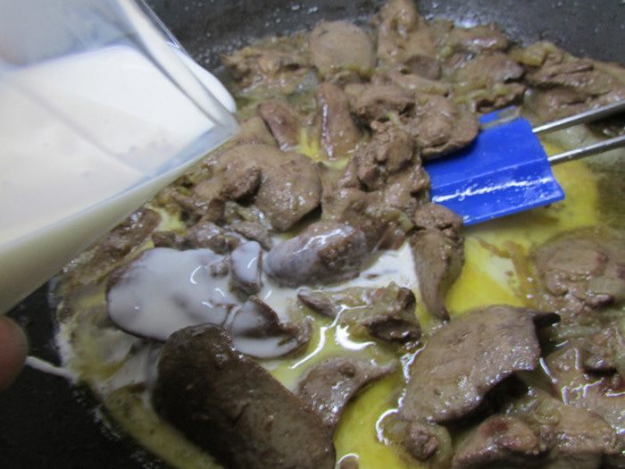 Добавьте сливки, дайте массе закипеть и потомите еще несколько минут. Затем добавьте соль, сахар и черный перец. Снимите с огня и дайте печени слегка остыть.