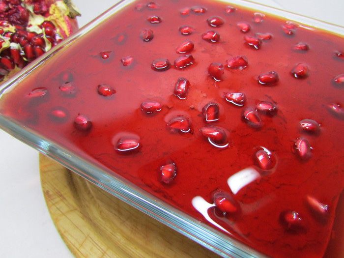 В сотейнике соедините оставшийся гранатовый сок и набухший желатин. Прогрейте, пока желатин полностью растворится. Желе слегка остудите.
