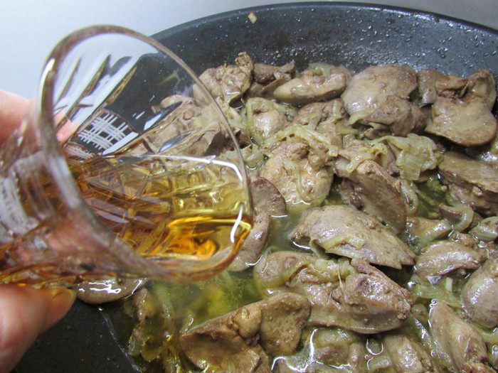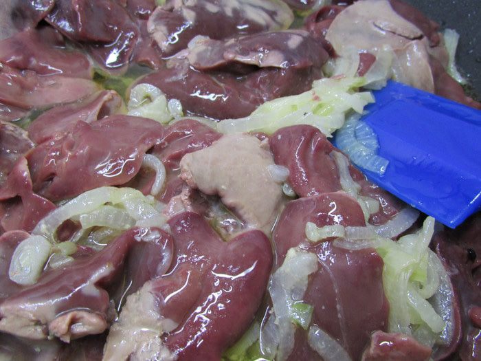 На сковороде растопите сливочное масло, добавьте оливковое масло и лук. Обжарьте лук до мягкого состояния. Затем добавьте печень и обжарьте 5 минут до легкой корочки на печени.