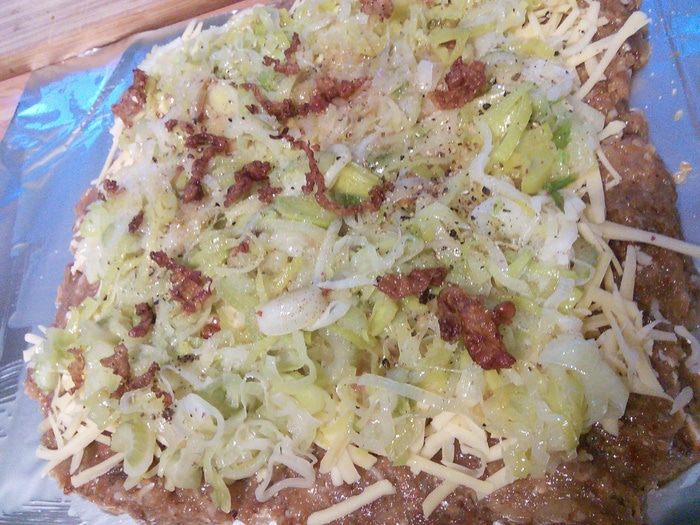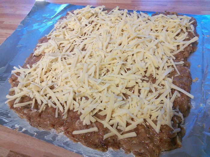 Фольгу смазываем оливковым маслом и выкладываем фарш прямоугольником. Маслом смазываем для того, чтобы фарш не прилип. Сыр трём на тёрке, выкладываем поверх фарша. Затем слой овощей. На сковородке вытапливаем бекон и выкладываем шкварочки на овощи.