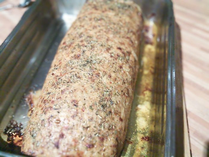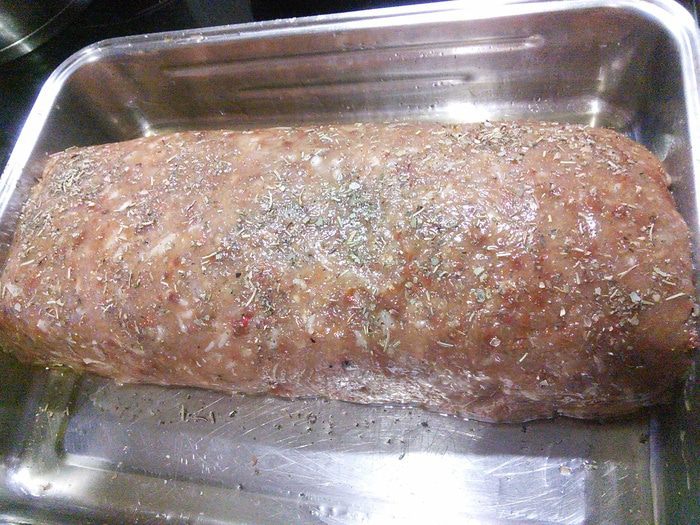 С помощью фольги заворачиваем нашу "конструкцию" в рулет, перекладываем на противень с бумагой или как я в форму, предварительно смазанную маслом. Сбрызнем маслом. Посыпаем прованскими травами.