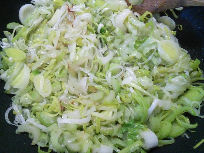 Сельдерей и порей шинкуем и обжариваем на оливковом масле до мягкости.