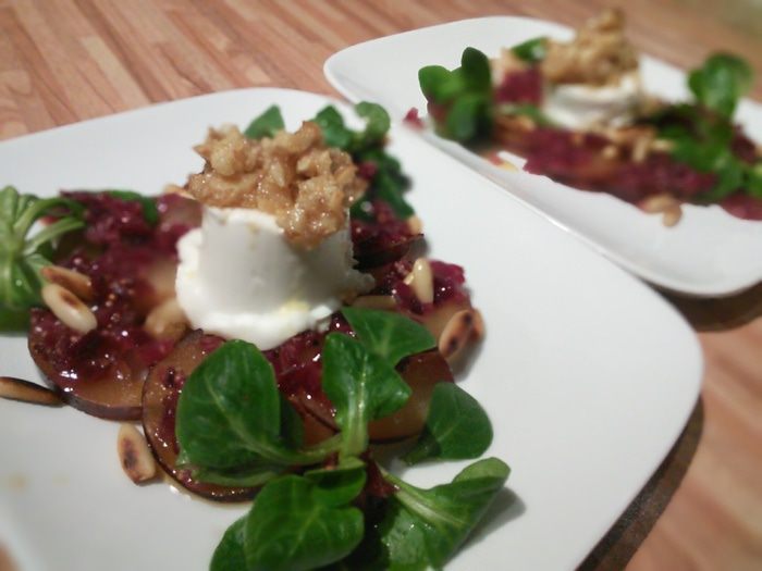 Козий сыр, запечённый под ореховой корочкой на сливовом карпаччо