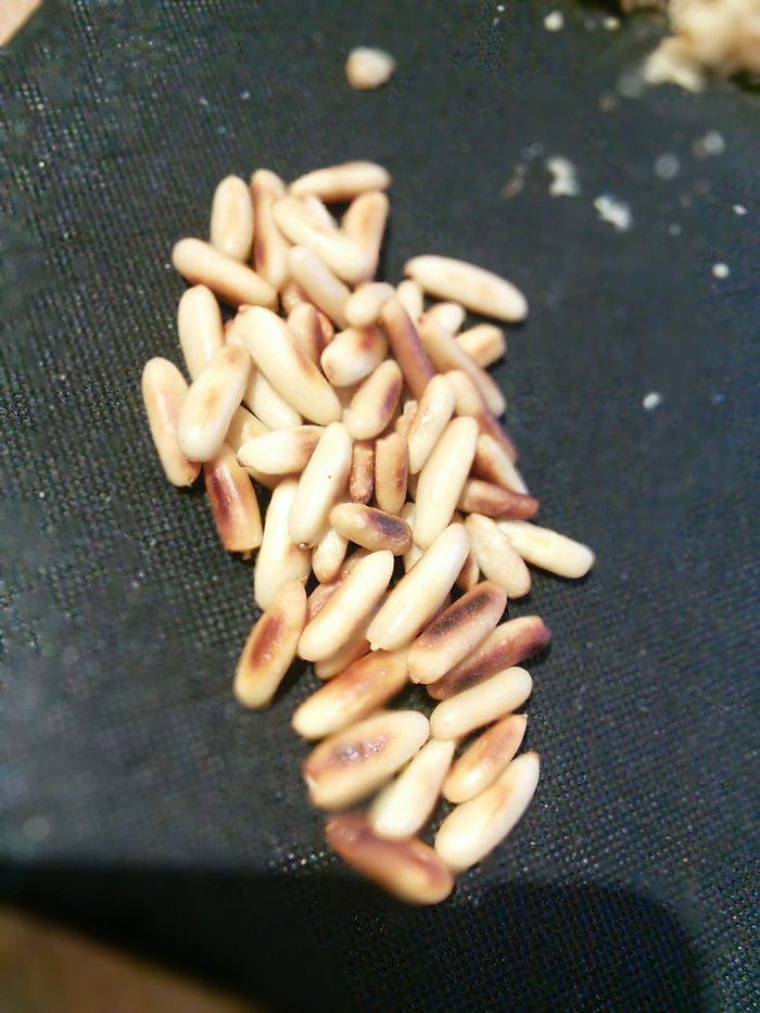 Кедровые (у меня пиния) орешки поджарила на сухой сковороде до румяного цвета. Рукколы у меня не оказалось, я заменила её другим зеленым салатом.