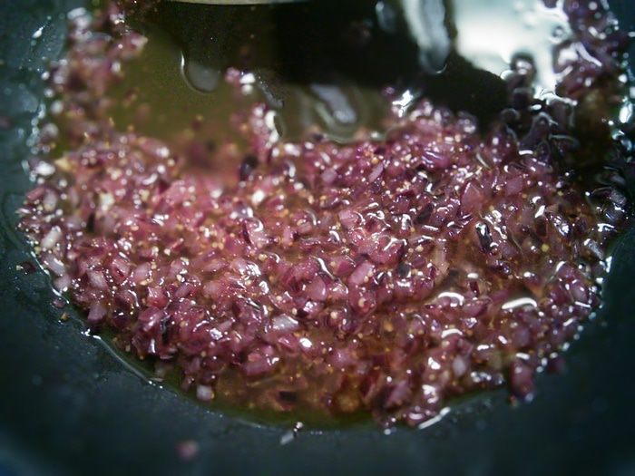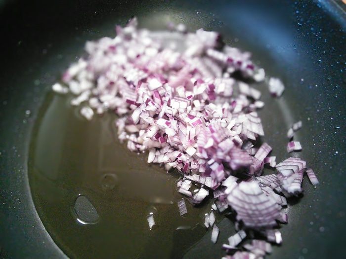 Маленькую головку красного лука мелко порубила. Разогрела 1 ст.л. масла и спассеровала лук до прозрачности.