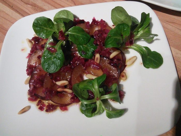 На сливу соус, выложите салат, не много, несколько веточек. И еще несколько капель соуса. Посыпьте кедровыми орешками.