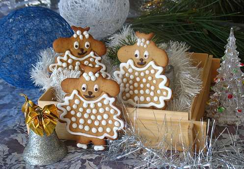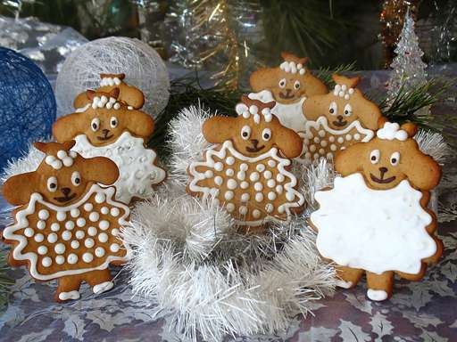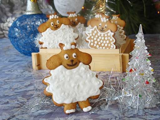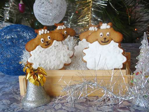 В новогодние праздники приятно побаловать себя пряными медовыми пряниками. А в этом году было очень много соблазнов. Да, до домиков я не доросла, а вот пряничные овечки приготовила. Это очень увлекательно - расписывать пряники. Но мои мальчишки отказались мне помогать. Разрисовывала сама, спасая овечек от поедания.