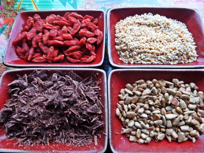 Готовим обсыпку, в которой будем обваливать конфетки. Семечки желательно слегка обжарить на сухой сковороде.