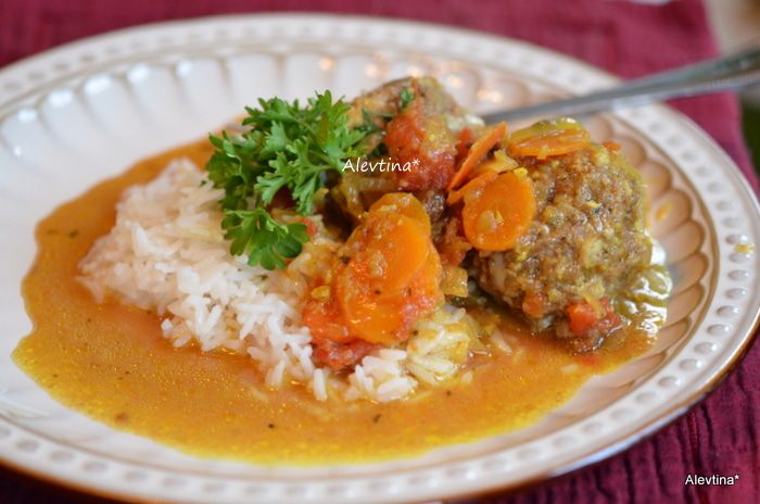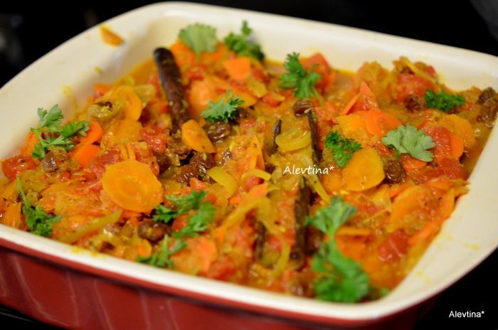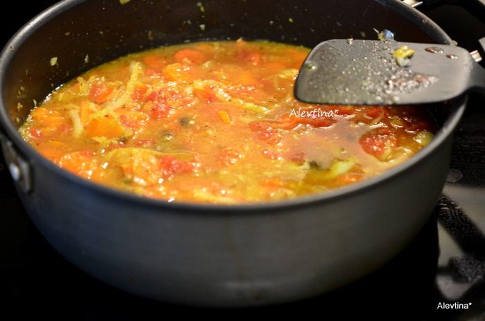 Затем добавим бульон, томаты, порезанные кубиками в соку, и изюм. Тушим.