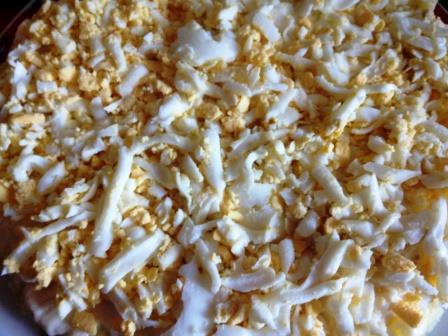На блюдо выложить тертый картофель. Смазать майонезом. Присолить.